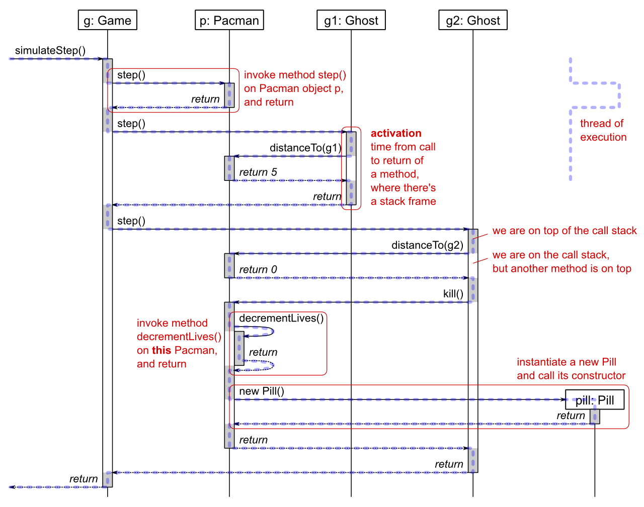 | method return | dashed arrow from callee activation to caller activation |