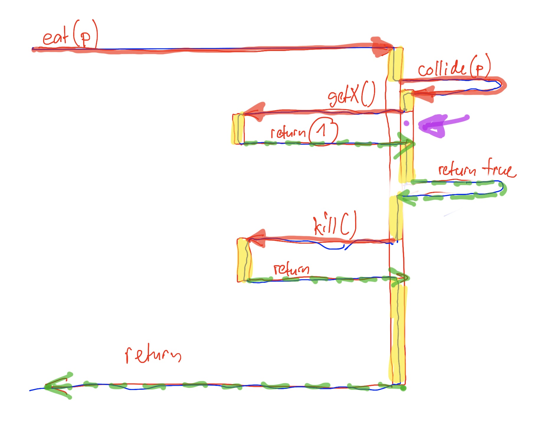 | thread | line through all calls and returns from start to finish of diagram |