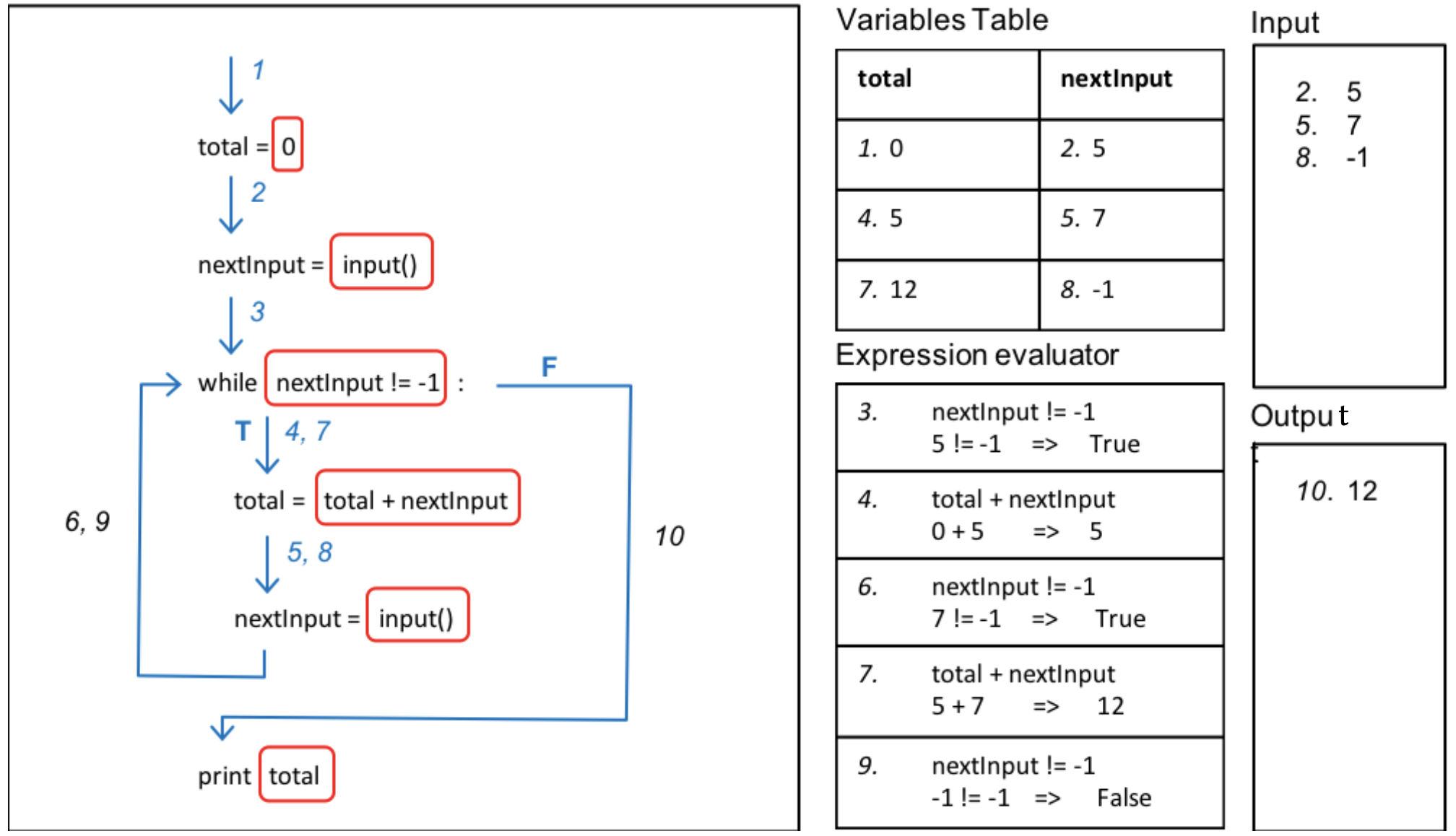 First, mark code with control flow paths and parts of the code containing expressions. Second, start at the top of the program and execute each line adding or looking up any necessary information from the memory table, expression evaluation or output areas.