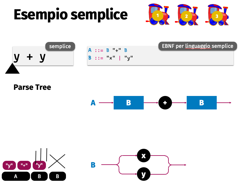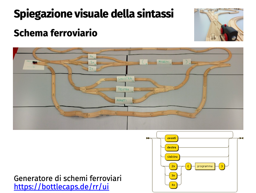 Pushing a train engine through the track makes visible the process of interpretation (generation or parsing) of the grammar (that is the track).